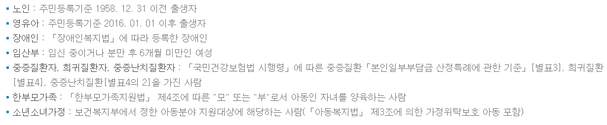 주민등록표상의 수급자(본인) 또는 세대원이 노인, 영유아, 장애인, 임산부, 중증질환자, 희귀질환자, 중증난치질환자, 한부모가족, 소년소녀가정(가정위탁보호 아동 포함) 중 하나에 해당하는 경우가 필요합니다.