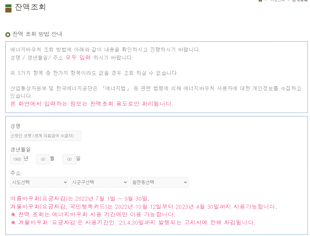 - 세대원 모두가 보장시설 수급자이거나 세대원 모두가 3개월 이상 장기 입원 중인 경우에는 에너지바우처 지원 제외 대상입니다.