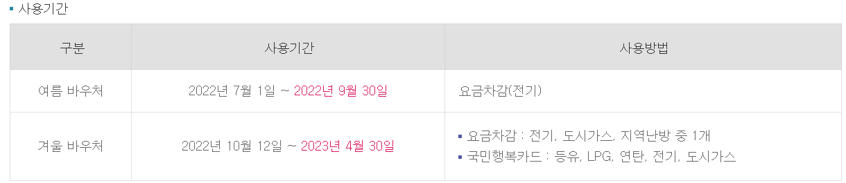 ① 에너지바우처의 '여름 바우처' 사용 방식은 요금차감 방식입니다. 사용 기간은 2022년 7월 1일부터 2022년 9월 30일까지이며, 이는 전기요금 자동 차감 방식을 의미합니다. 전기요금 고지서를 읍·면·동 행정복지센터에 제출하여 신청하면, 에너지바우처가 자동으로 차감되어 사용됩니다.
