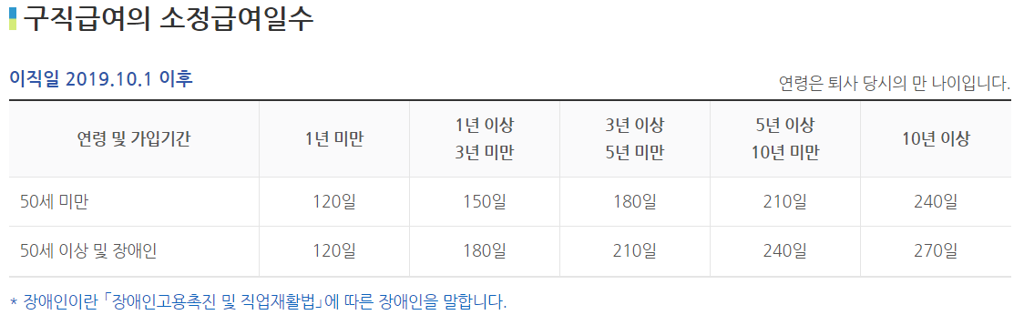 실업급여 수급기간은 나이, 월급, 근무한 기간 등에 따라 차이가 있으나, 일반적으로 120일에서 270일 사이로 설정되어 있습니다. 아래의 자료에 따르면 이직일 2019년 10월 1일을 기준으로 그 이전과 이후에 따라 실업급여 수급기간이 차이가 있으니 참고하시기 바랍니다.