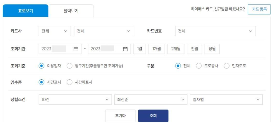 5. 하이패스 카드 정보와 조회기간을 입력하여 조회