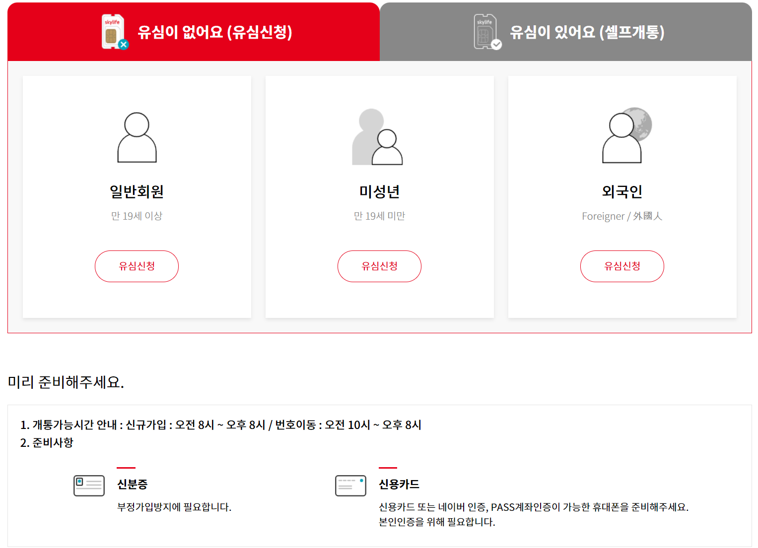 셀프 개통을 위한 준비물은 유심 칩, 본인 인증을 위한 신분증(주민등록증 또는 운전면허증) 그리고 본인 명의의 신용카드입니다. 이외에 신용카드가 아닌 네이버 인증이나 카톡 인증도 대부분 가능합니다.