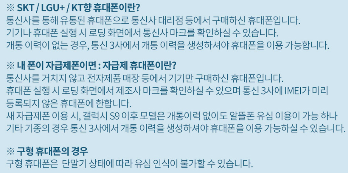 자급제폰은 통신사에서 제공하는 기기가 아니므로 호환성이 보장되지 않을 수 있습니다. 이러한 이유로 알뜰폰 가입방법에서 휴대폰 구입에 앞서 알뜰폰 요금제를 먼저 선택한 후 맞는 휴대폰을 구매하는 것이 호환성 문제를 줄이는 방법입니다.