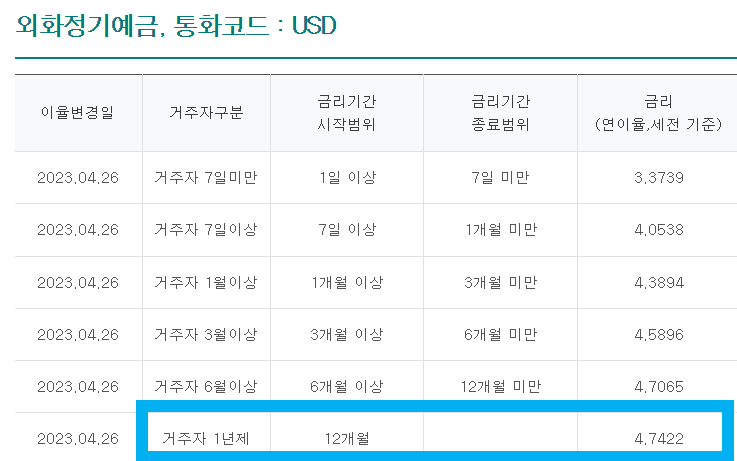 하나은행 외화 정기예금 금리비교를 보면, USD 달러는 12개월의 경우 약 4.7%가 가장 높습니다.