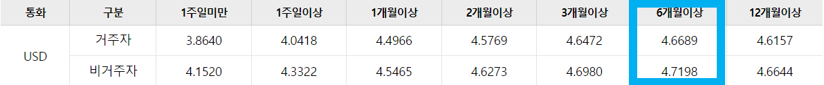 우리은행 외화 정기예금 금리비교를 보면, USD 달러는 6개월 이상 12개월 미만인 경우 약 4.6%가 가장 높습니다.