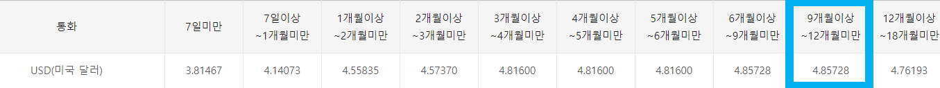 KB 국민은행 외화 정기예금 금리비교를 보면, USD 달러는 9개월 이상 12개월 미만인 경우 약 4.8%로 가장 높습니다.