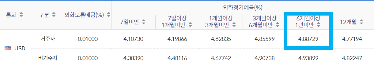 신한은행 외화 정기예금 금리비교를 보면, USD 달러는 6개월 이상 12개월 미만인 경우 약 4.8%로 가장 높습니다.