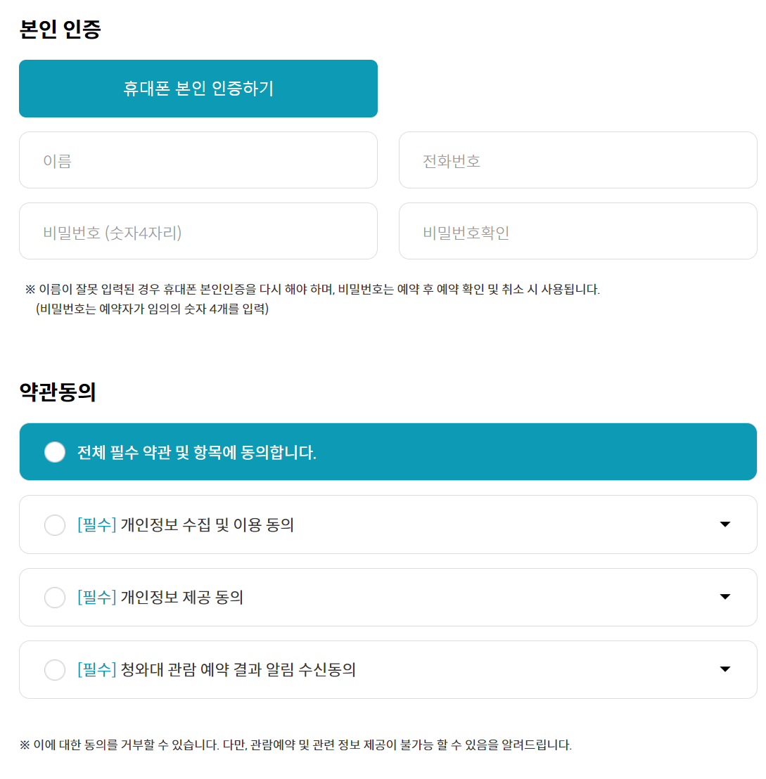 ③약관 동의 (약관에 동의하지 않으면 청와대 관람신청을 할 수 없으니, 전체 동의해주세요.)