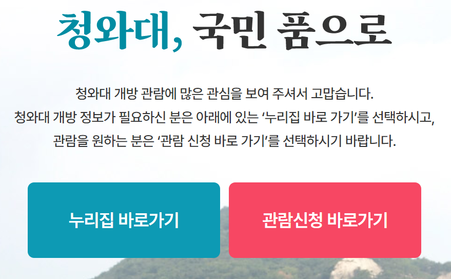 온라인 예약은 ' 청와대, 국민 품으로'라는 사이트를 통해 편하게 하실 수 있습니다.