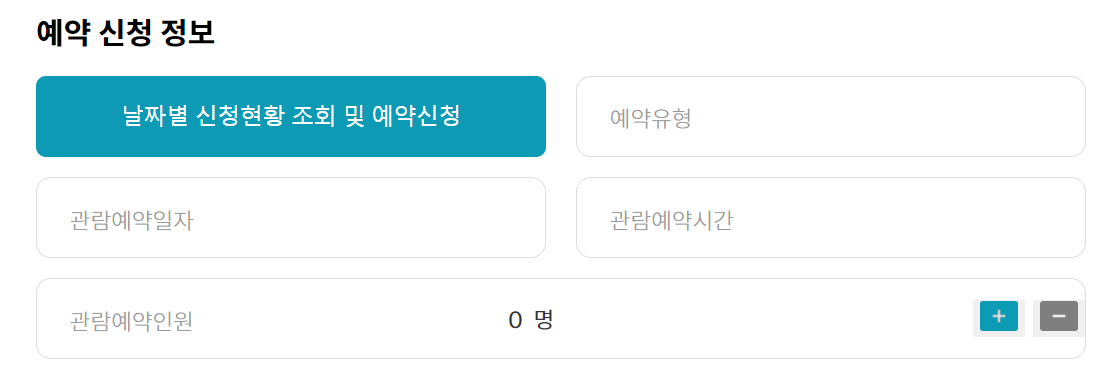 ①날짜별 신청 현황 조회와 예약신청 : 예약유형(개인1~6명), 관람예약일자, 관람예약시간, 관람예약인원