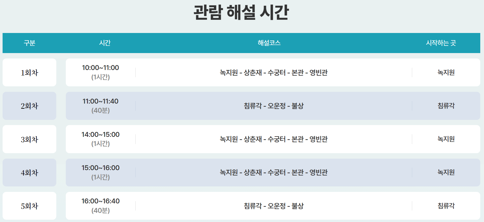 - 우천 시에는 일부 건물 내부는 관람이 제한될 수 있음