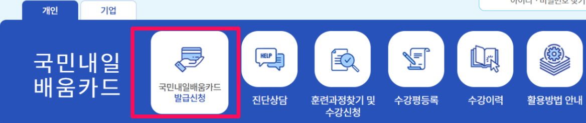 - 국민내일배움카드는 농협은행 또는 신한카드에서만 발급이 가능합니다.