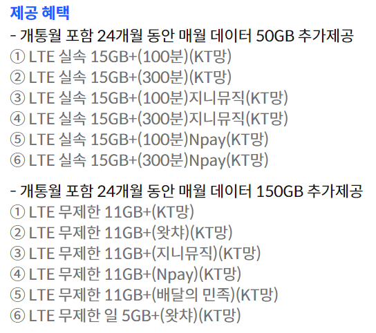- 프로모션 상품으로 기간 중 신규 또는 번호 이동 시 24개월 동안 매월 데이터 50GB 추가 제공 (50GB + 15GB + 3 Mbps)