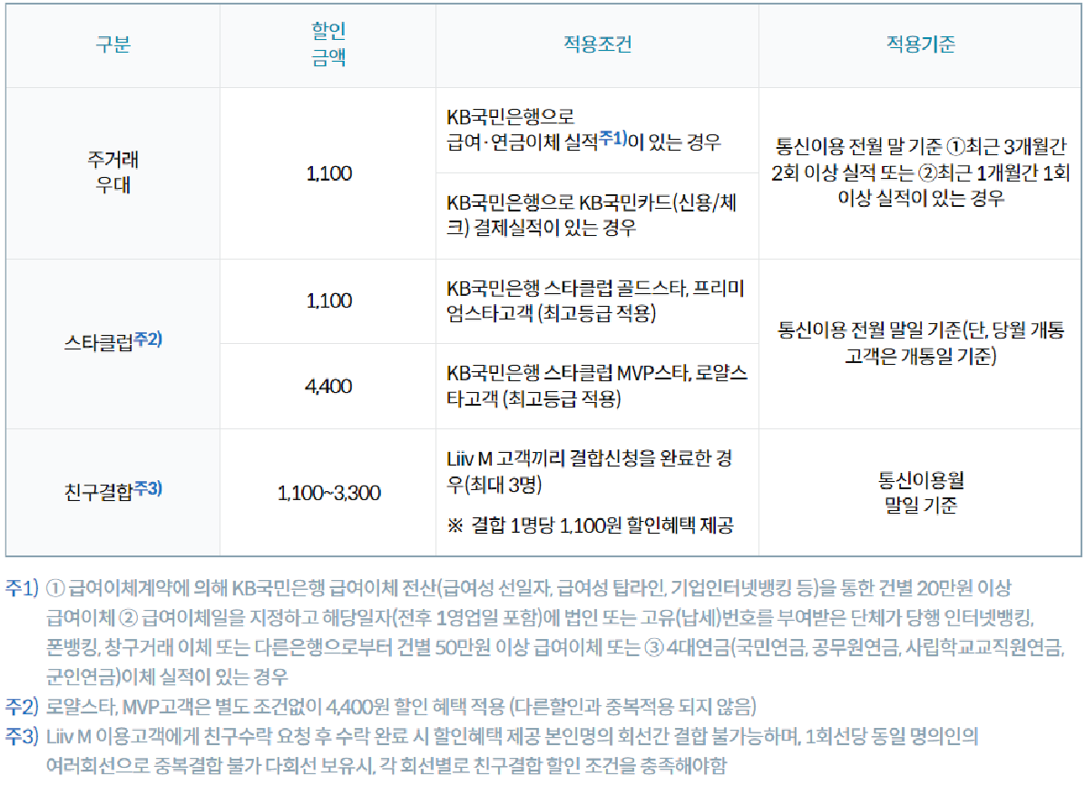 뿐만 아니라 KB국민은행 MVP스타, 로열스타고객은 별도 조건 없이 월 4,400원까지 할인이 가능합니다.