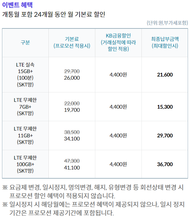- 프로모션 기간 동안 신규 또는 번호 이동 고객은 24개월 동안 매월 4,000원의 기본료 할인 혜택을 받을 수 있습니다. 이로 인해 총 96,000원의 할인 혜택을 받을 수 있습니다.
