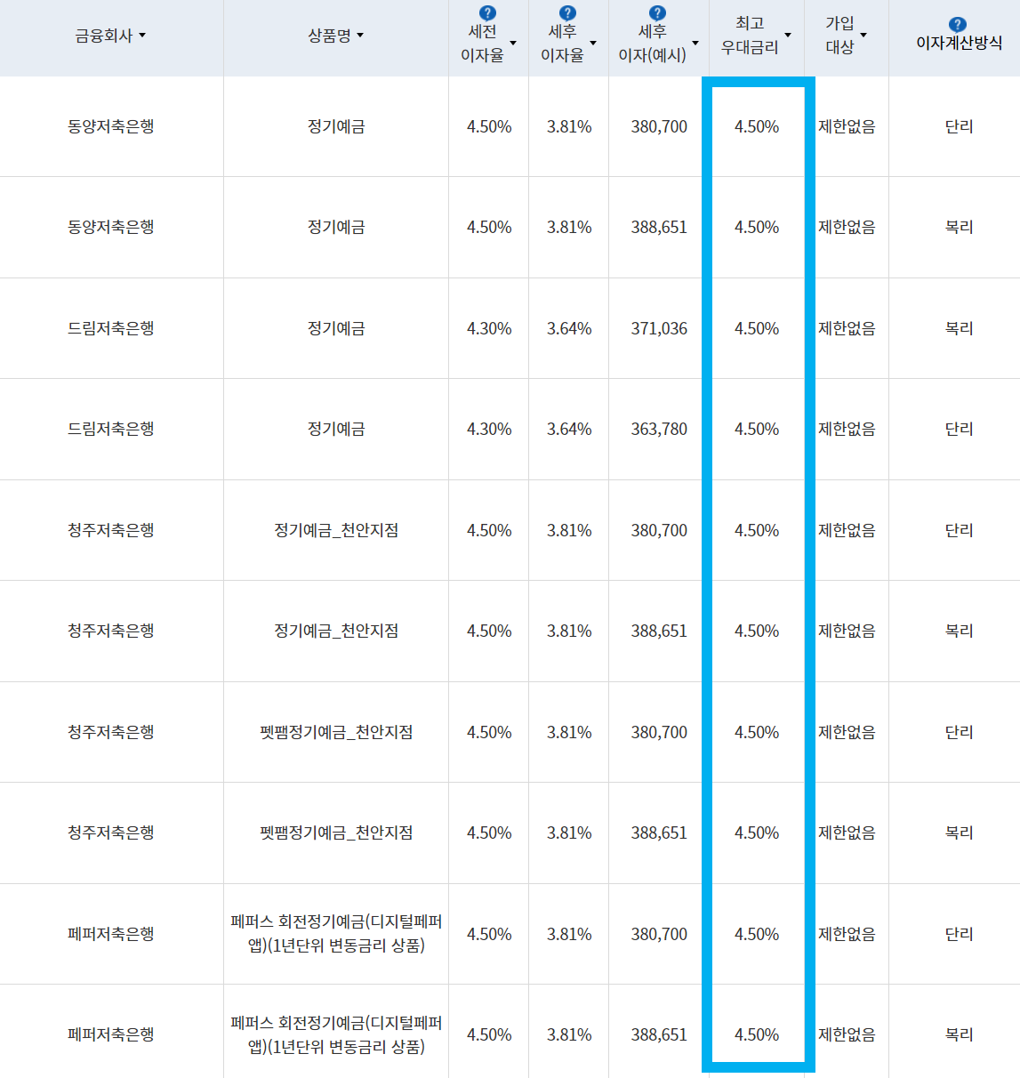 2금융권 5월 예금금리 가장 높은 곳은 상위 10개 은행 모두 4.50%의 예금 금리를 보여주고 있습니다.