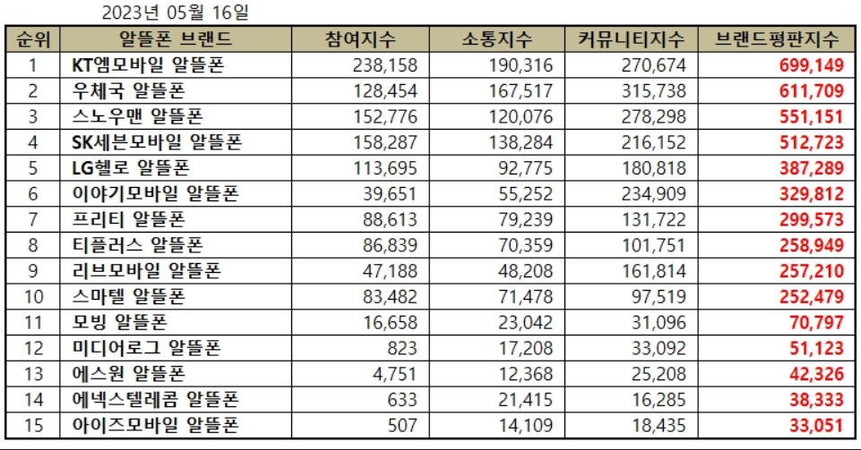 알뜰폰 통신사의 순위를 비교하는 것은 알뜰폰 통신사가 고객 서비스의 약점을 알뜰폰 요금제 단점으로 가지고 있기 때문인데, 알뜰폰 통신사의 브랜드 평가가 높을 수록 고객 만족이 높다고 평가할 수 있기 때문에 알뜰폰 요금제 비교를 하실 때에는 알뜰폰 통신사의 순위도 함께 고려해보시는 것이 좋습니다.