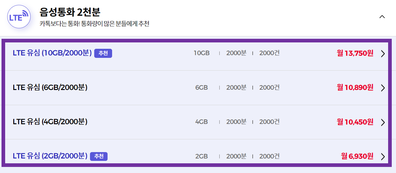 데이터 1.3GB ~ 2GB, 통화 2,000분 또는 기본제공, 문자 2000건 또는 기본제공