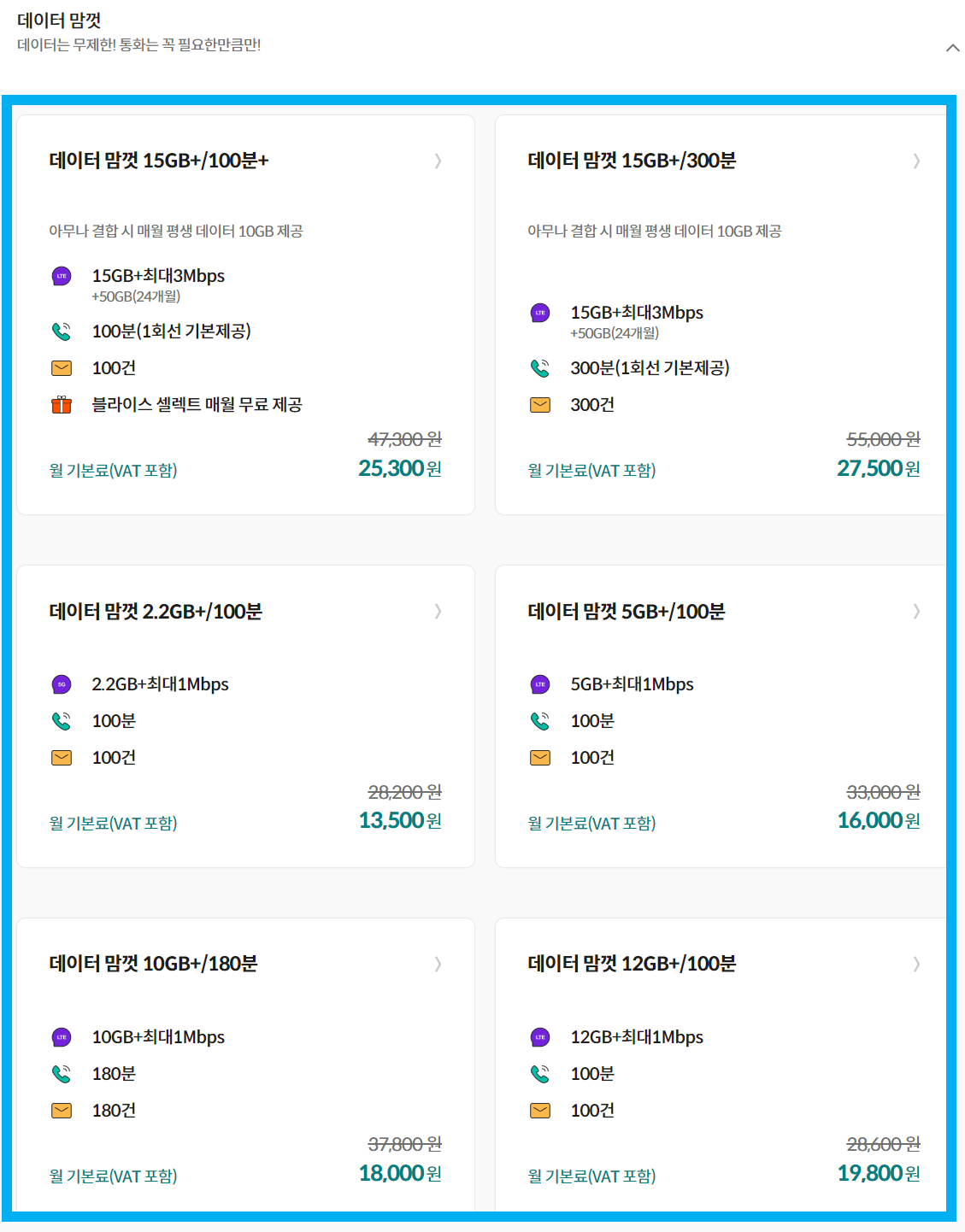 데이터 15GB+3Mbps, 통화 100분, 문자 100건