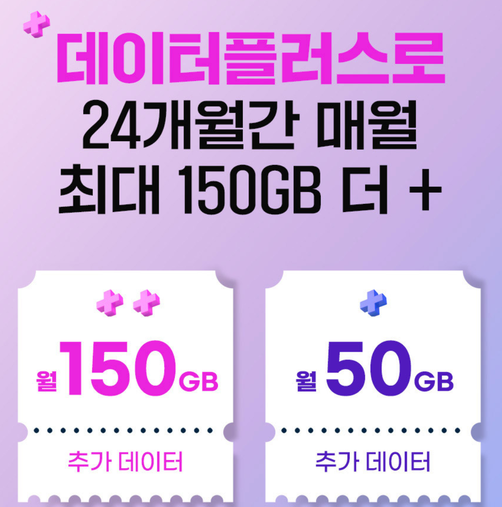 SK세븐모바일의 데이터플러스는 24개월 간 매월 최대 150GB를 더 제공 받는 프로모션입니다. 신규가입과 번호이동 고객에 한해 추가 데이터를 제공하는 알뜰폰 요금제입니다.