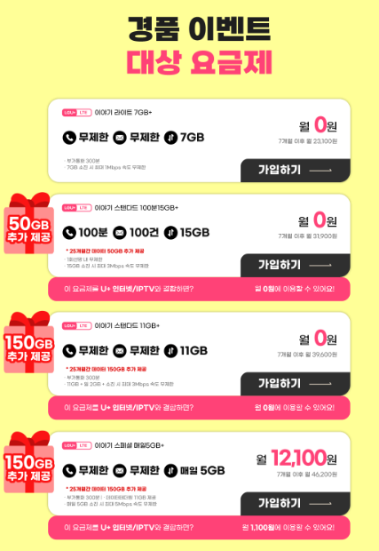 - 경품이벤트 참여 대상 요금제는 180일 유지기간이 있고 180일 안에 중도 해지할 경우 위약금이 청구되니 주의하시기 바랍니다.