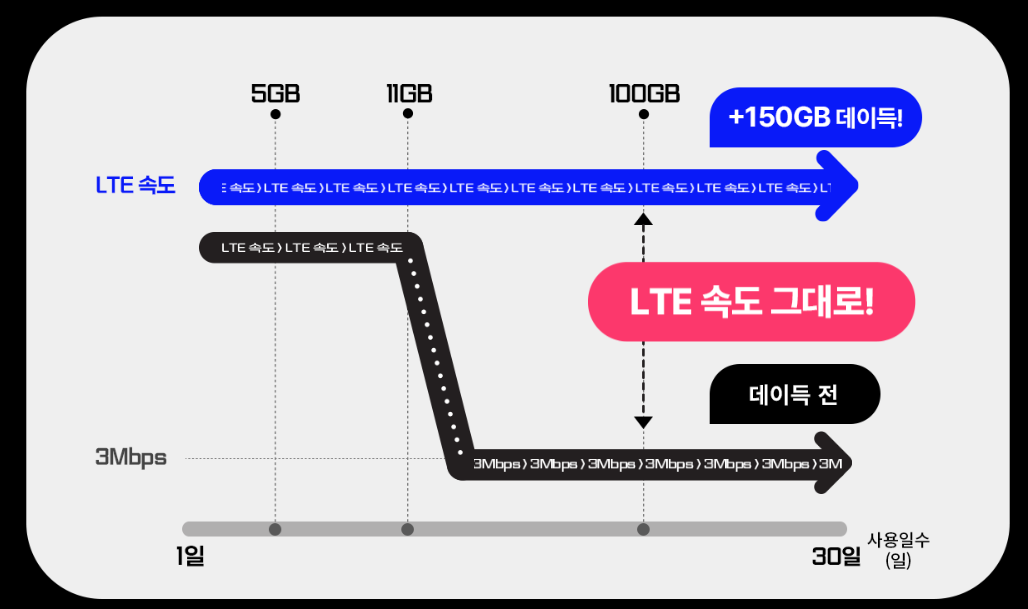 - 데이터 차감 순서 : 추가 제공 데이터 150GB → 요금제 기본제공량 → Qos순서로 제공됩니다.