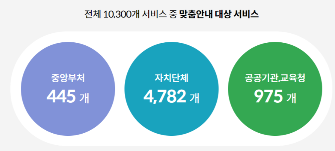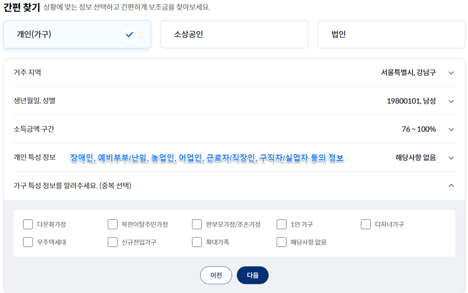 로그인 없이 간편 찾기를 하시게 되면 개인의 인적 사항을 등록하여 지원 받을 수 있는 정부 보조금의 목록을 확인하실 수 있습니다.