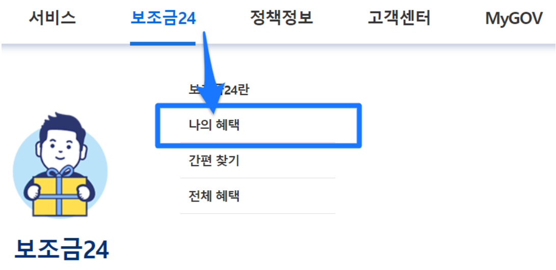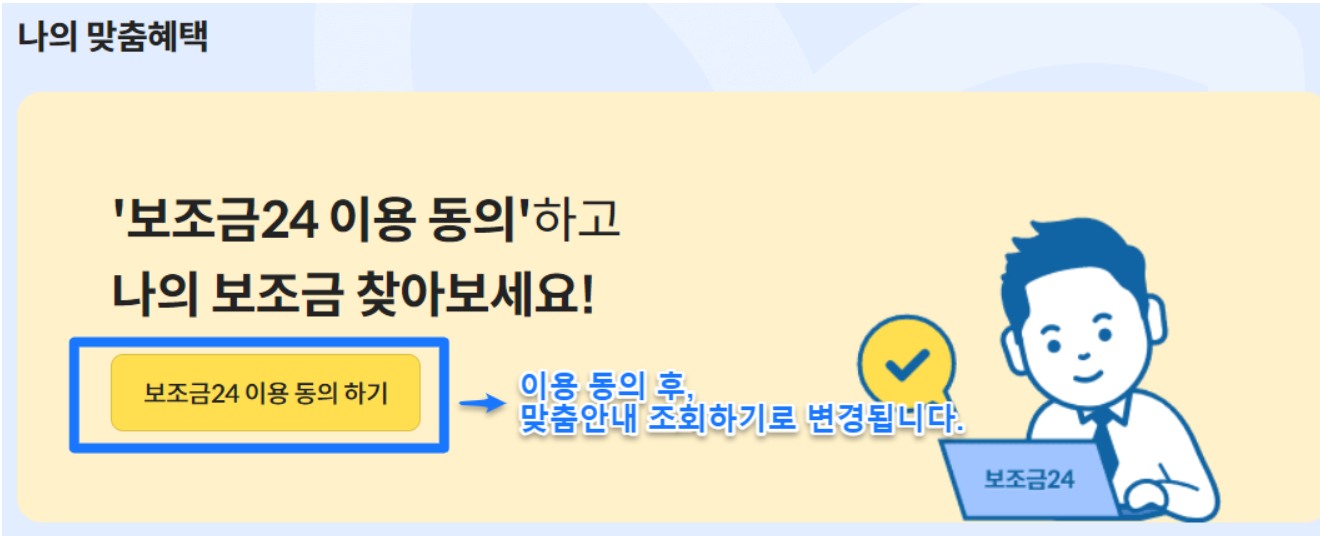 정부24 홈페이지 → 보조금24 → 나의 혜택 → 보조금24 이용 동의 → 맞춤안내 조회하기 클릭~!