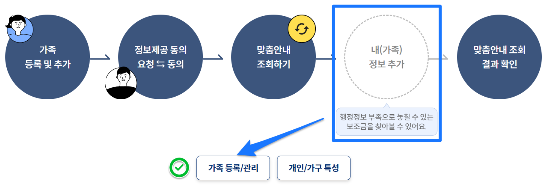가족 정보 제공 동의 요청 → 가족원에 [문자 발송] → 가족원이 정부24에서 동의 → 보조금 확인 가능