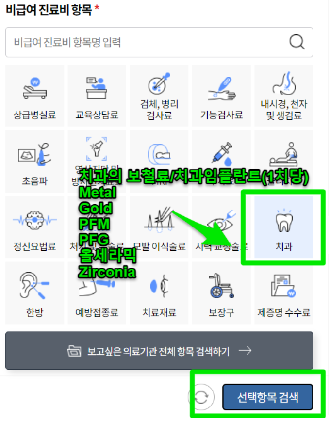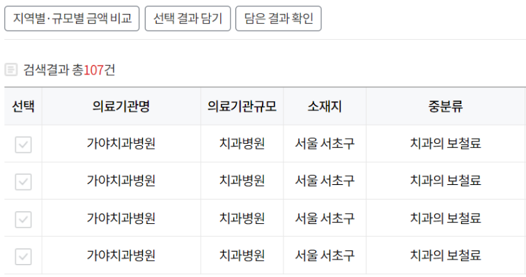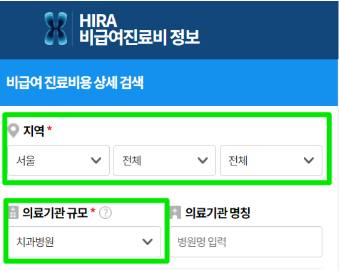 ▶건강보험심사평가원→비급여 진료비 정보→지역, 의료기관 규모, 비급여 진료비 항목 입력