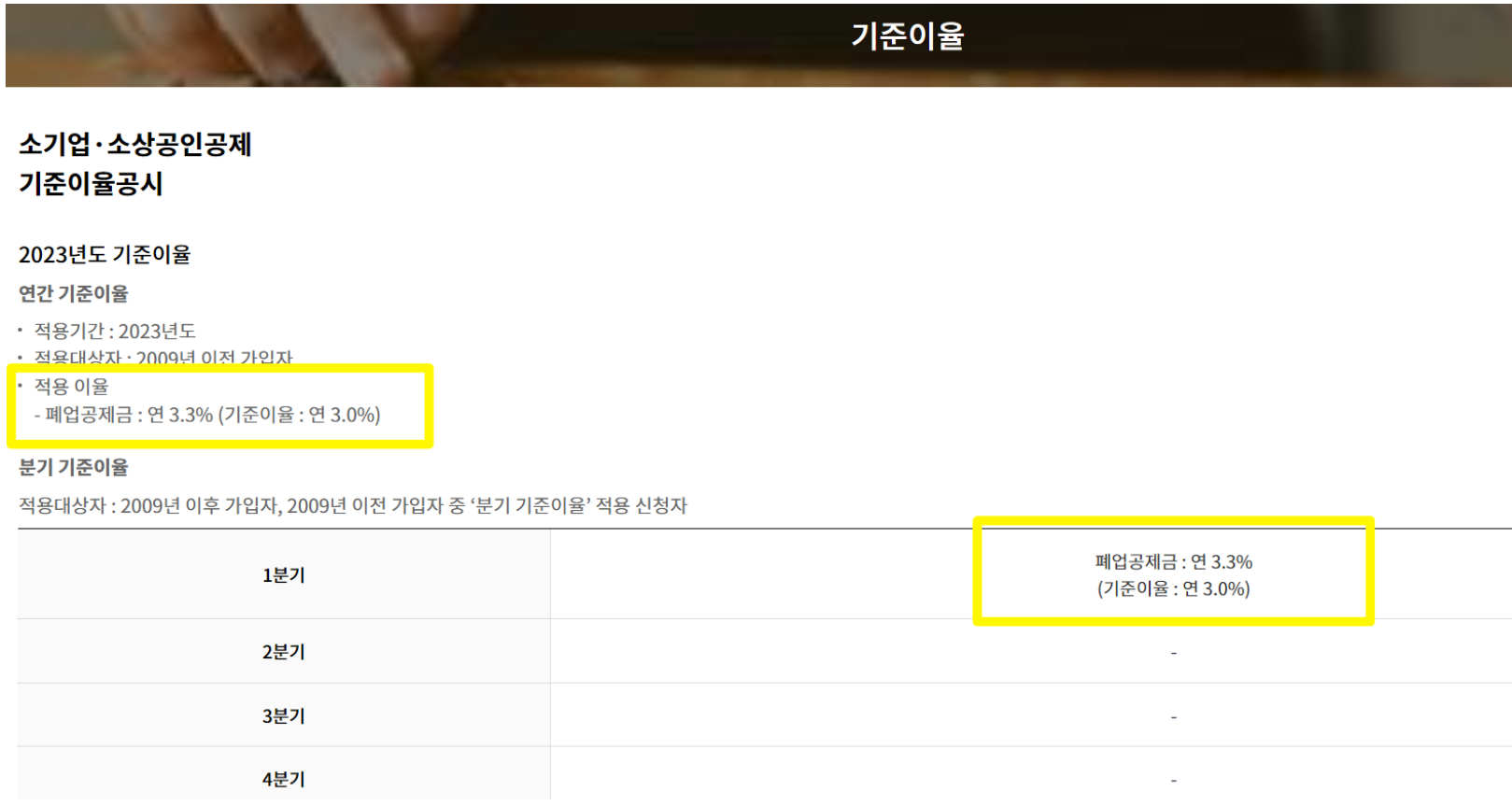 노란우산공제에서는 공제금에 대하여 적금 이자와 같은 이율을 제공합니다. 2023년 1분기 폐업공제금의 적용 이율은 연 3.3%에 해당합니다. (2009년 이후 가입자)