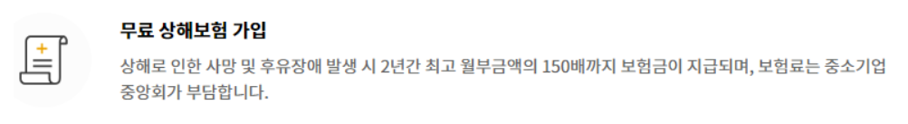 상해로 인한 사망 및 후유 장애 발생 시 2년 간 최고 월 부금액의 150배까지 보험금이 지급되며 보험료는 중소기업중앙회가 부담하는 무료 상해보험 가입이 가능합니다.